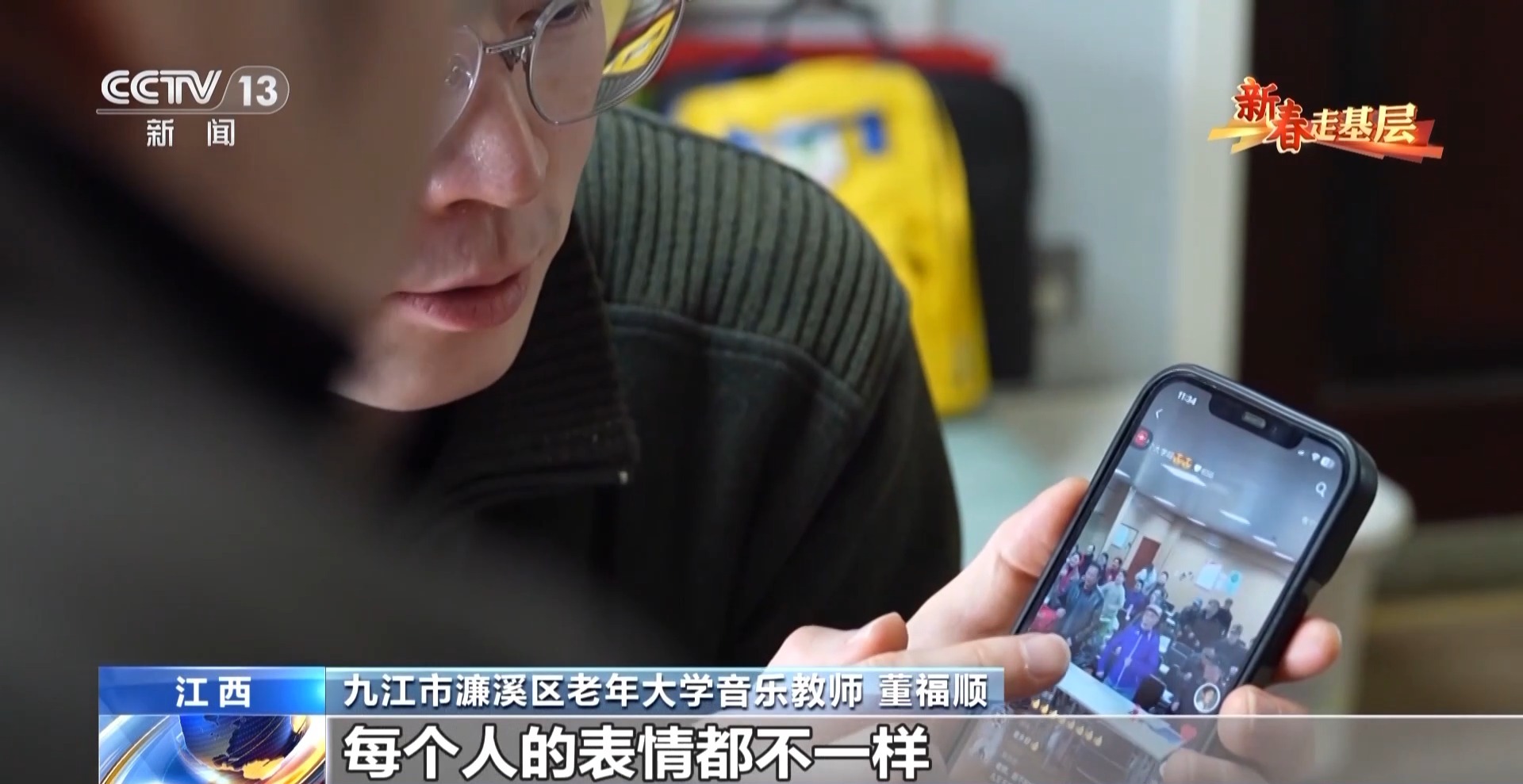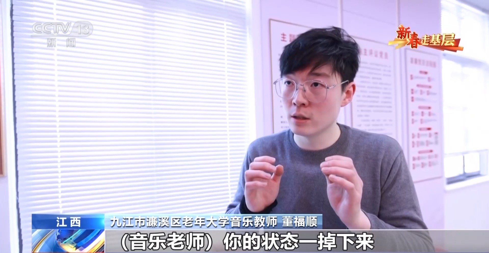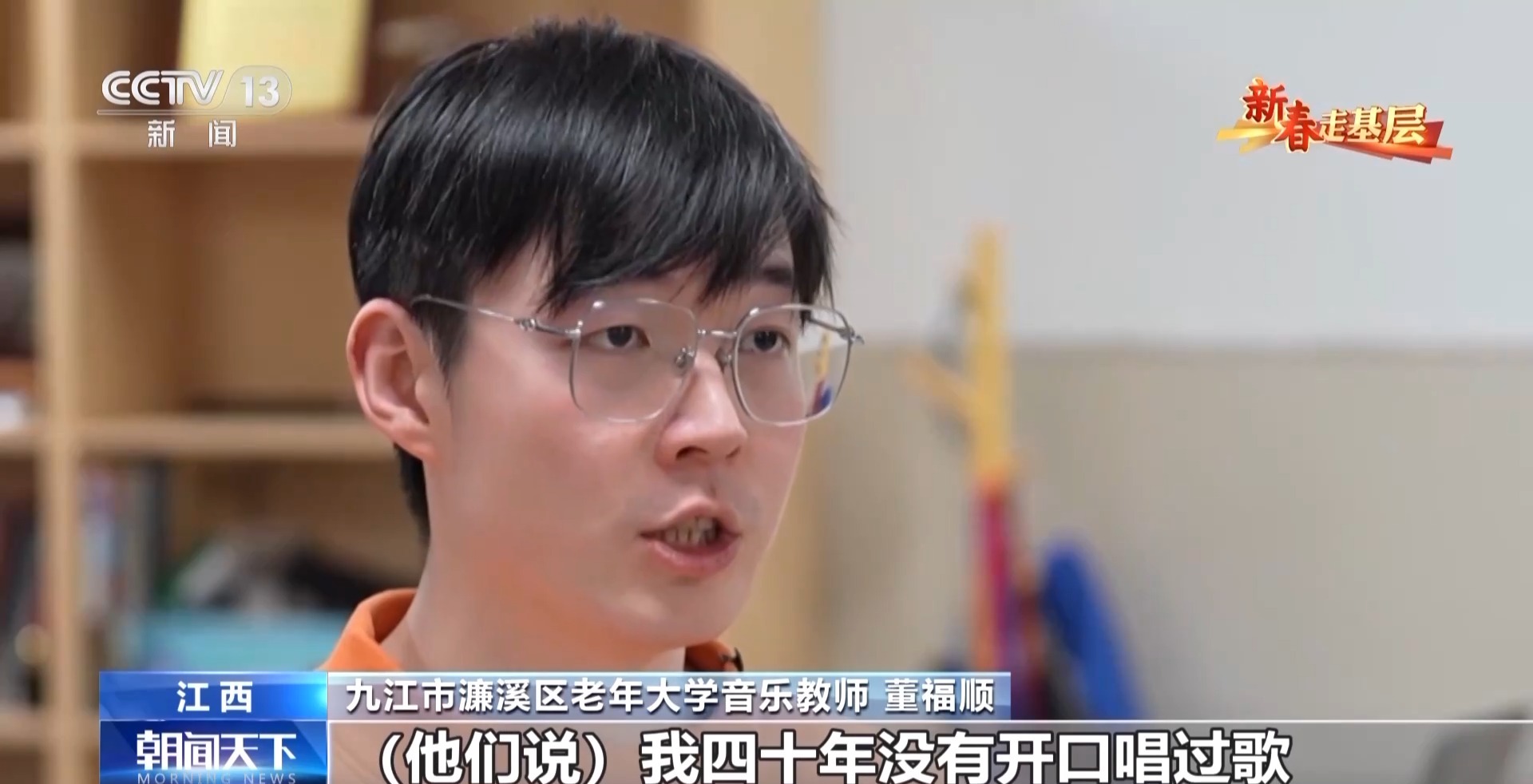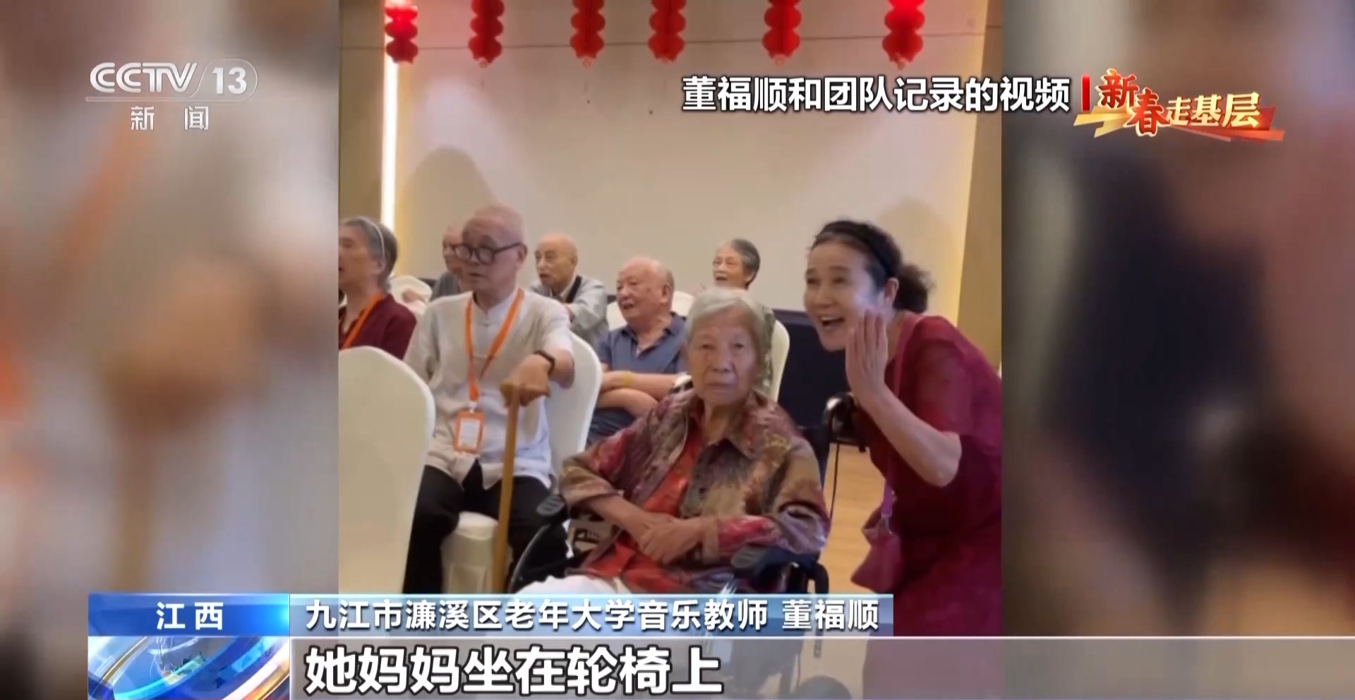 九江市濂溪區(qū)老年大學(xué)音樂教師 董福順:我去了之后,他們說我四十年沒有開口唱過歌,已經(jīng)很久很久,他們說都快忘了這首歌的歌詞了,你過來了,讓我想起了它。所以我覺得我又一次被認(rèn)可了,我也覺得是他們在給我一點(diǎn)能量,當(dāng)看著他們唱回憶起的這些歌曲的時候,他們坐直了,開始朝我揮手去唱,我覺得這件事做對了。