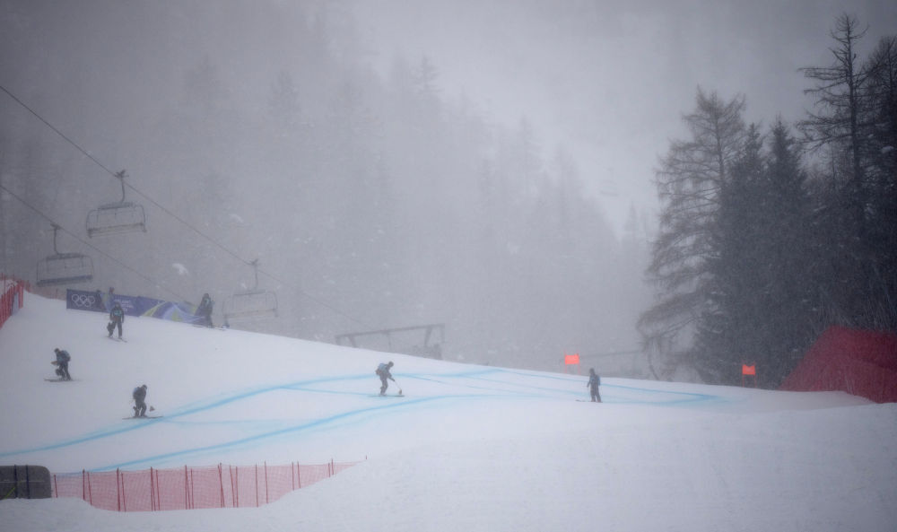 2月7日,高山滑雪女子滑降第三次官方訓(xùn)練受天氣影響中斷。圖為工作人員在賽道上。新華社記者 費(fèi)茂華 攝
