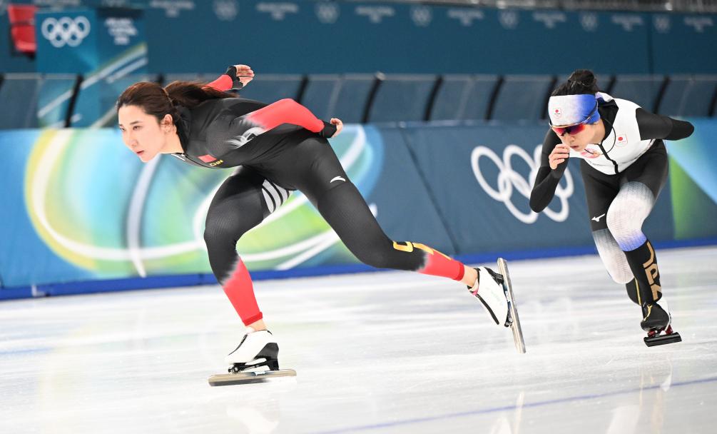 2月5日,中國(guó)運(yùn)動(dòng)員韓梅(左)和日本運(yùn)動(dòng)員高木美帆在訓(xùn)練中。新華社記者 武巍 攝