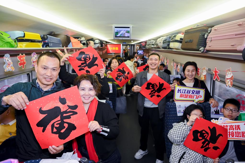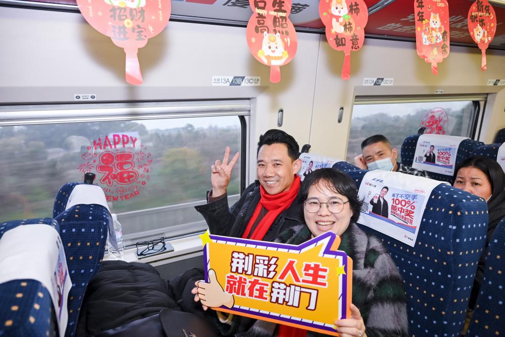 喜慶春聯(lián)、福字窗花、吉祥燈籠……2月7日,布置一新的G1136次列車,載著800多名在外務工的湖北荊門人從廣州啟程,一路歡聲笑語中,奔赴他們闊別已久的家鄉(xiāng)。