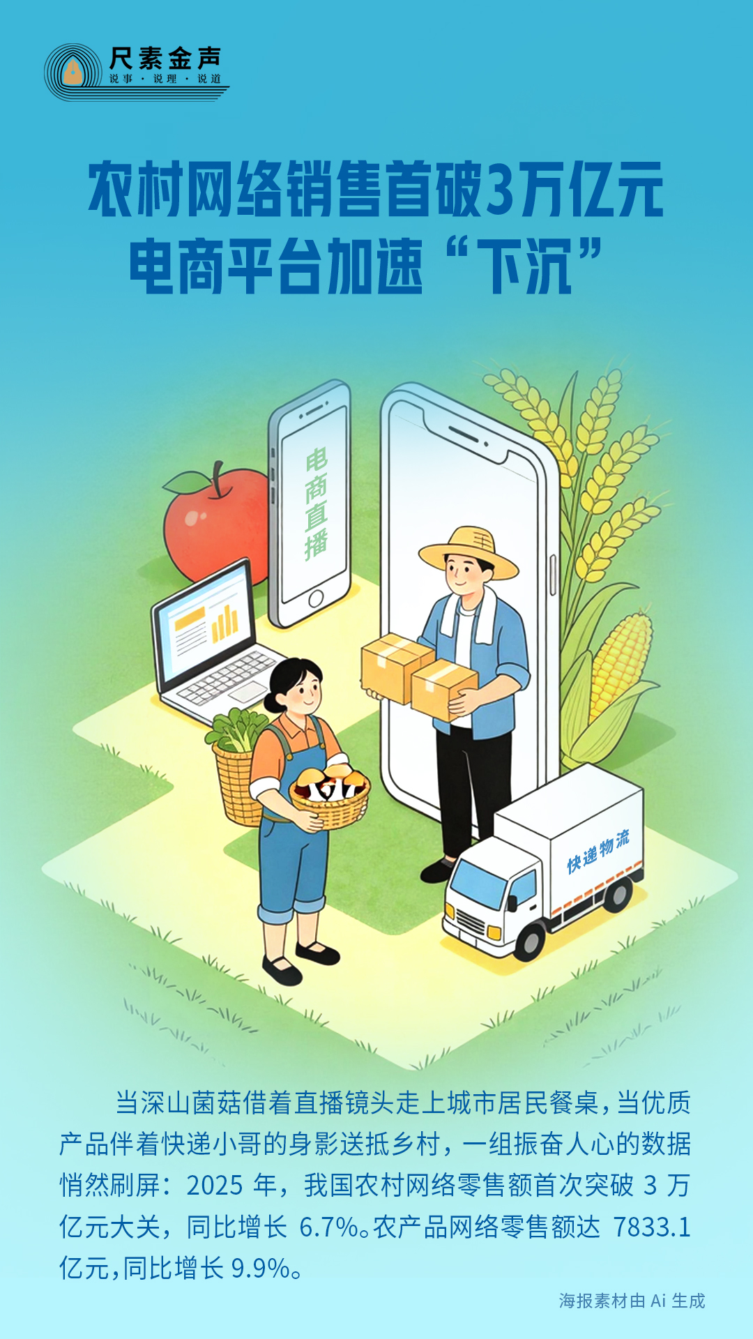 當深山菌菇借著直播鏡頭走上城市居民餐桌,當優(yōu)質(zhì)產(chǎn)品伴著快遞小哥的身影送抵鄉(xiāng)村,一組振奮人心的數(shù)據(jù)悄然刷屏:2025年,我國農(nóng)村網(wǎng)絡零售額首次突破3萬億元大關,同比增長6.7%。農(nóng)產(chǎn)品網(wǎng)絡零售額達7833.1億元,同比增長9.9%。