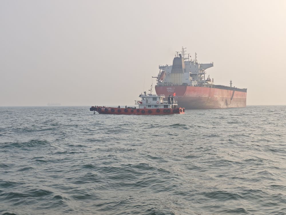 抵達錨地時,一艘有數(shù)層樓高的貨輪如鋼鐵島嶼般錨泊在湛藍海面上。李博通過擴音器與船上人員聯(lián)系后,與一名同事爬上軟梯進行登船檢查。