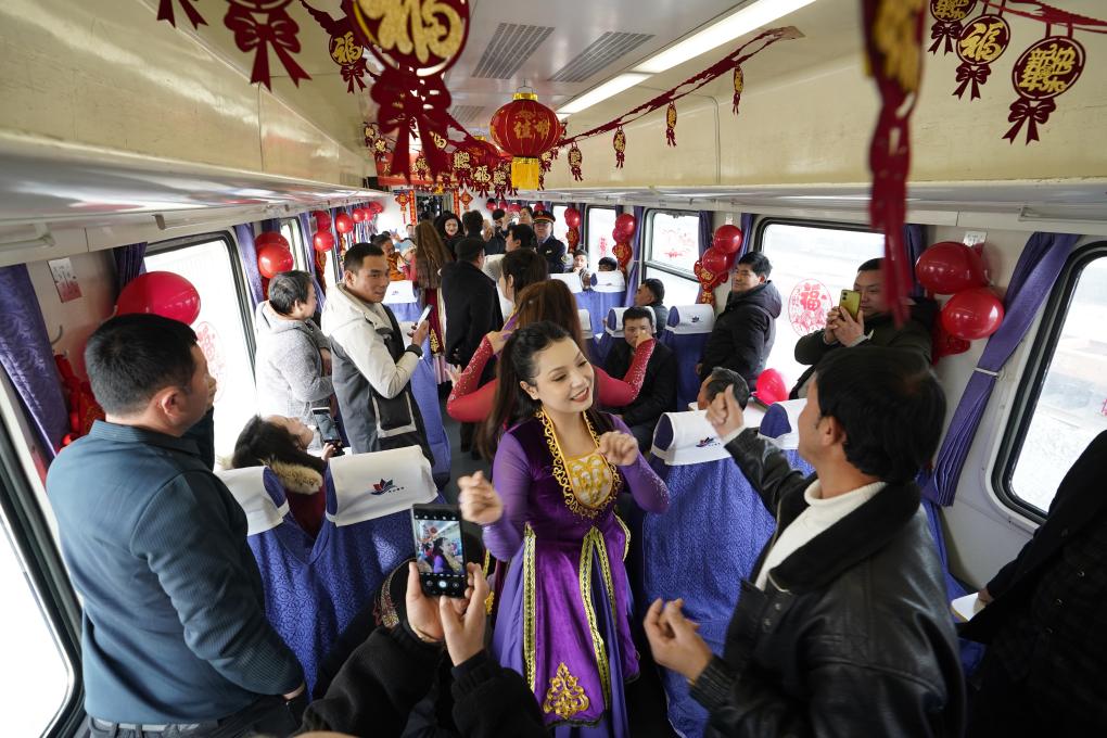 車(chē)窗外,廣袤的戈壁灘一望無(wú)際;車(chē)窗內(nèi),新春的煙火氣越來(lái)越濃。不同的鄉(xiāng)音此起彼伏,手邊是大包小裹的心意,話里話外,是對(duì)團(tuán)圓的期盼。