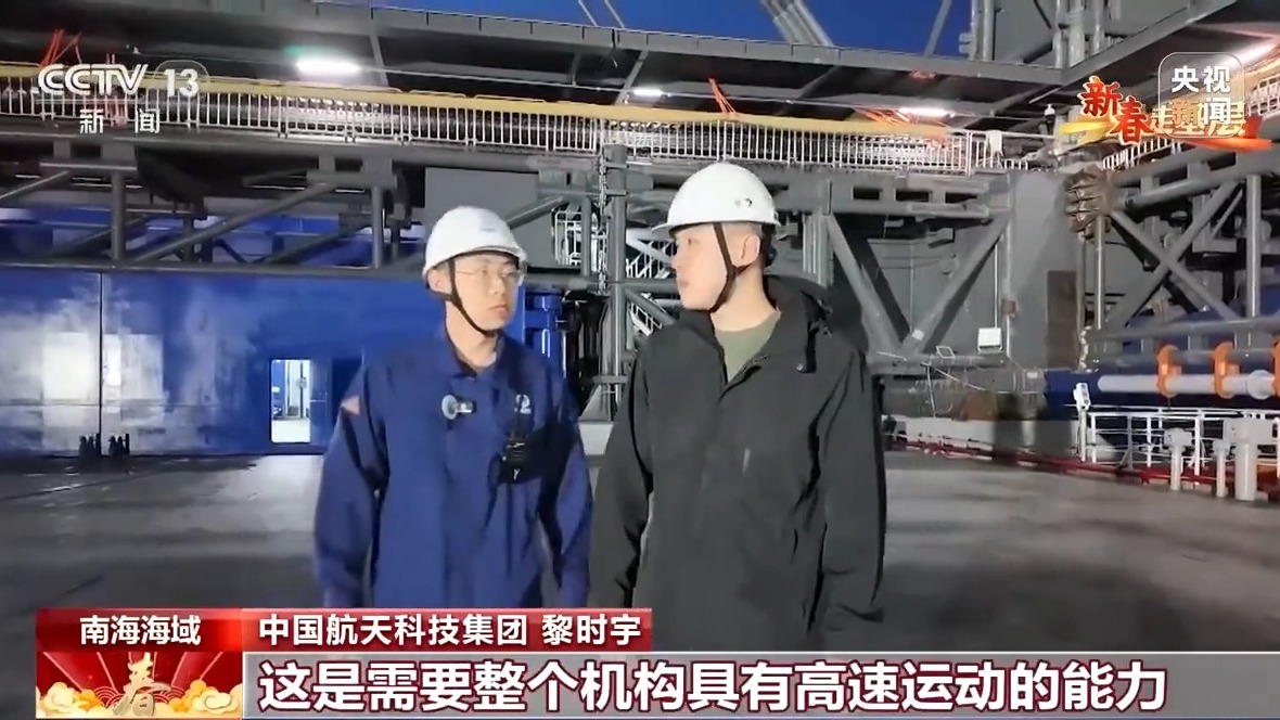 總臺記者 馬宇辰:“領(lǐng)航者”號海上回收平臺長144米,寬50米,滿載排水量超過2.5萬噸,是個名副其實的大家伙。但是發(fā)射塔架的高度接近70米,加上船體和天線,整體的高度接近30層樓高,所以它的重心是非常高的,再加上冬天的海況比較惡劣,我的感覺就是整個船體都在不規(guī)律地?fù)u晃著。