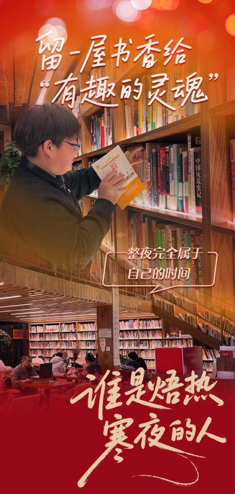 短短一個(gè)月,程澤鑫結(jié)識(shí)了很多“有趣的靈魂”——有一位白天在廚房“顛勺”的“書友”,嫌工作場所嘈雜,靜不下心,隔三岔五就來這里“泡”著,一讀就是一宿。有一回,程澤鑫見他讀得出神,水杯見底,便過去幫他續(xù)熱水,兩人就這么熟識(shí)了。