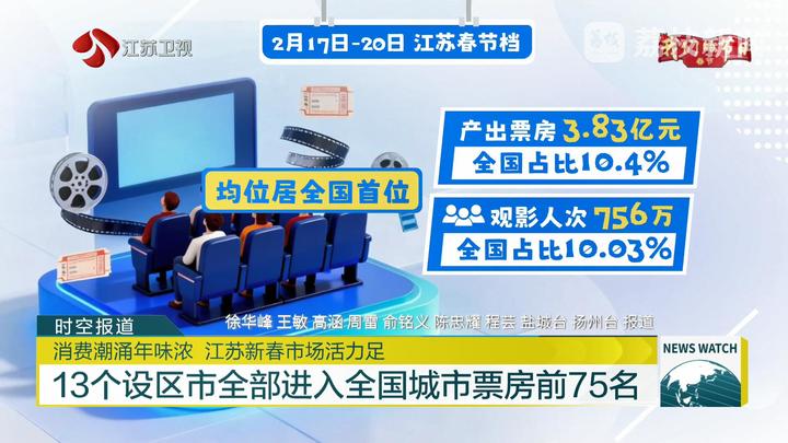 電影票房是文化消費活力的風(fēng)向標。截至目前,全國春節(jié)檔電影總票房已突破40億元。作為全國票倉,江蘇電影市場持續(xù)領(lǐng)跑全國:2月17日至20日,江蘇產(chǎn)出票房超3.83億元,全國占比10.4%;觀影人次超756萬,全國占比10.03%,票房和人次均位居全國首位。放眼全國,江蘇展現(xiàn)出“萬馬奔騰”的票房趨勢,13個設(shè)區(qū)市全部進入全國城市票房前75名,蘇州、南京、南通、無錫、鹽城五市進入全國前20名。