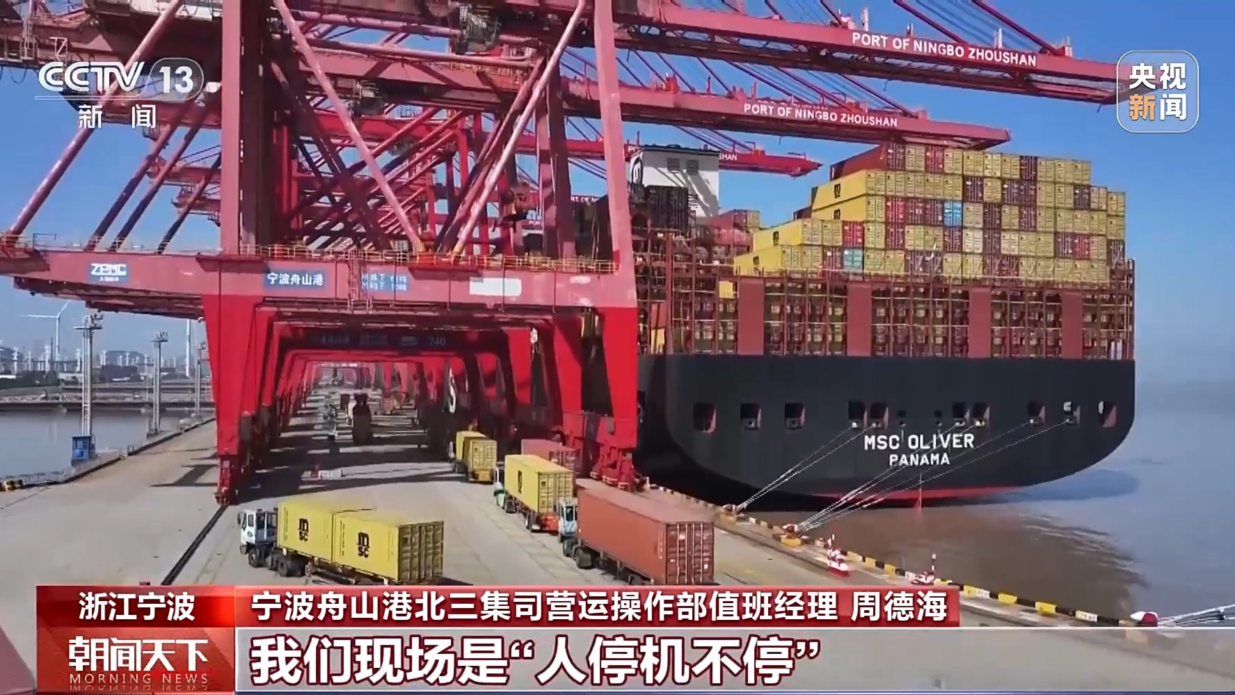 寧波舟山港北三集司營(yíng)運(yùn)操作部值班經(jīng)理 周德海:這條船載重量超過(guò)了19萬(wàn)噸,這回在我們港區(qū)的作業(yè)量超過(guò)了兩萬(wàn)標(biāo)準(zhǔn)箱,像這樣的船型,整個(gè)春節(jié)期間還是比較多的。這幾天出口箱量增長(zhǎng)比較明顯,我們現(xiàn)場(chǎng)是“人停機(jī)不?!薄9?jié)后的第一波出口集中,客戶都希望搶時(shí)間、趕船期,我們也爭(zhēng)分奪秒確保貨物能及時(shí)出運(yùn)。