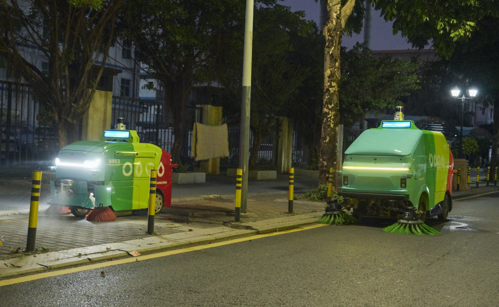 在深圳市坪山區(qū)石井街道,環(huán)衛(wèi)機(jī)器人進(jìn)行夜間協(xié)同作業(yè)(資料照片)。