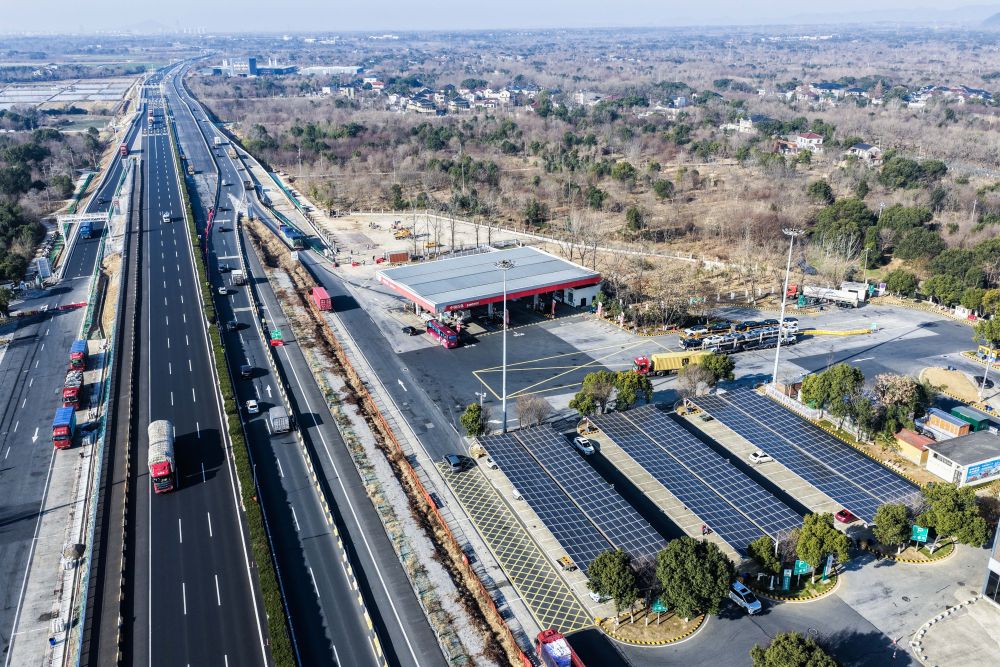 2026年1月7日拍攝的G50滬渝高速長興服務(wù)區(qū)(無人機照片)。太陽能光伏板下是升級完成的高速服務(wù)區(qū)充電站。新華社記者 徐昱 攝