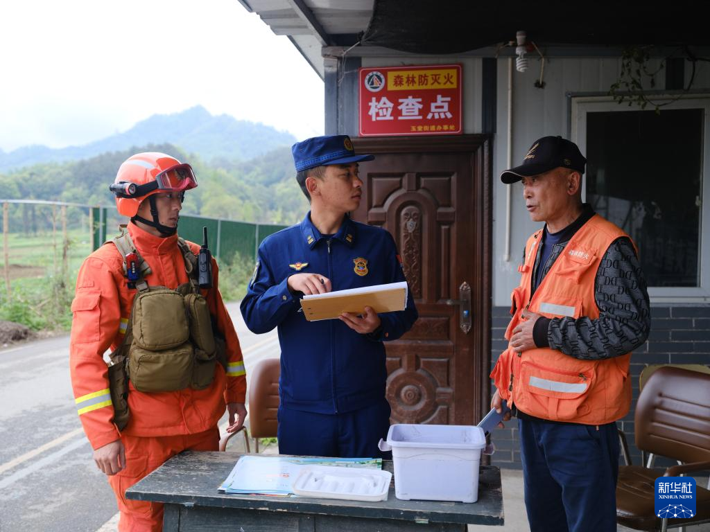 3月29日,消防救援人員(左、中)在都江堰林區(qū)入口進行防火檢查。