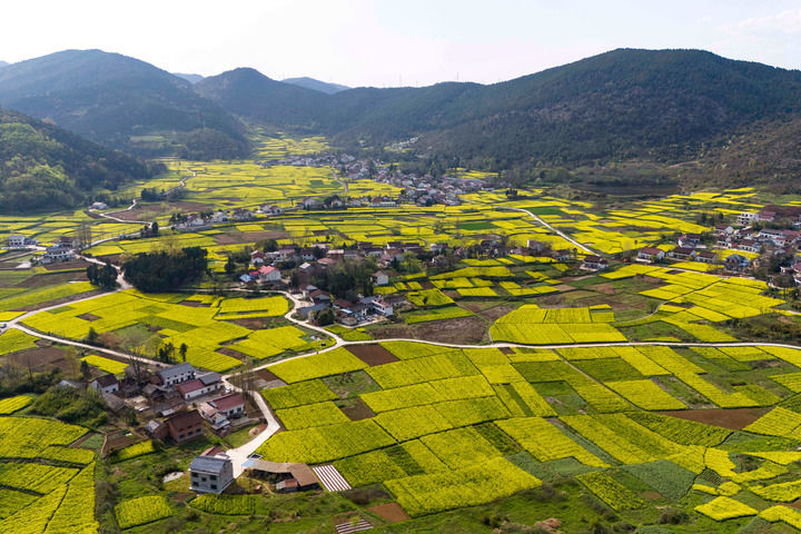 3月28日拍攝的漢中市南鄭區(qū)陽(yáng)春鎮(zhèn)陳村的油菜花海(無人機(jī)照片)。新華社記者 鄒競(jìng)一 攝