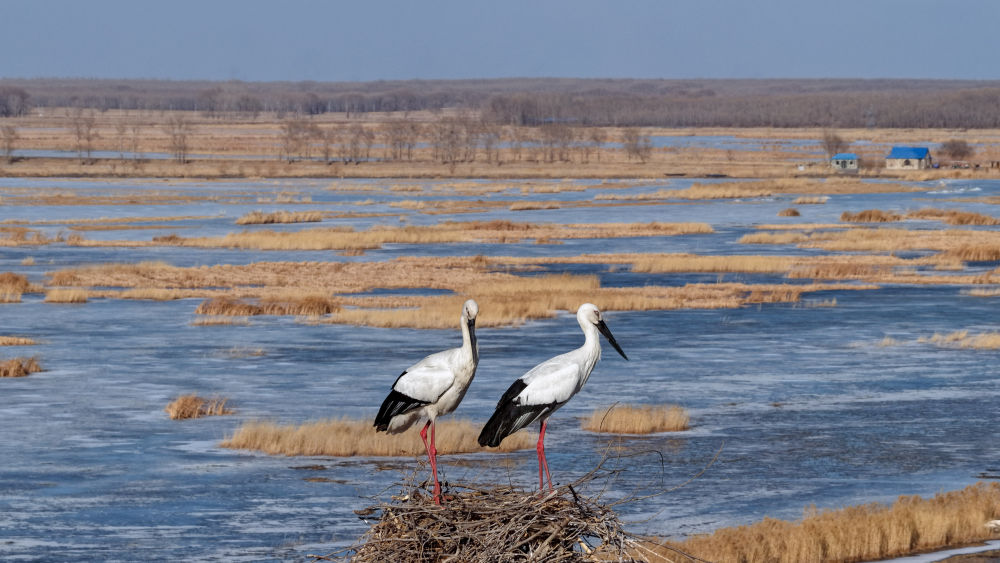 吉林省莫莫格國家級自然保護區(qū)內(nèi),東方白鸛在筑巢。新華社發(fā)(潘晟昱 攝)
