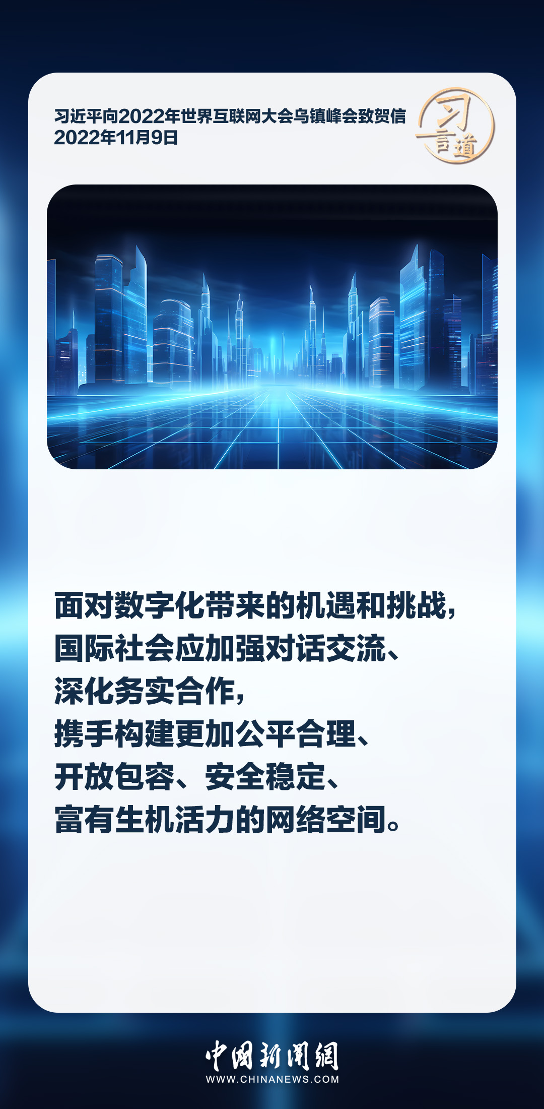 信息革命時(shí)代潮流浩蕩前行,網(wǎng)絡(luò)空間承載著人類對(duì)美好未來(lái)的無(wú)限憧憬。習(xí)近平主席多次強(qiáng)調(diào)各國(guó)應(yīng)該共同構(gòu)建網(wǎng)絡(luò)空間命運(yùn)共同體,推動(dòng)網(wǎng)絡(luò)空間互聯(lián)互通、共享共治,為開(kāi)創(chuàng)人類發(fā)展更加美好的未來(lái)助力。