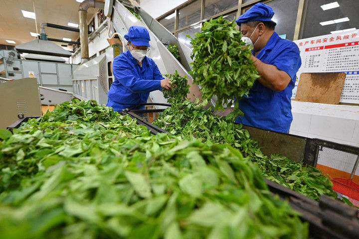 2025年6月7日,工人在海南省農(nóng)墾五指山茶業(yè)集團股份有限公司保亭金江五指山分公司茶廠加工茶葉。海南大葉茶是海南省中部山區(qū)特有的茶種,在2024年被證實和發(fā)現(xiàn)是一種新的山茶屬物種。目前,五指山、保亭、白沙等市縣不斷擴大種植規(guī)模,將茶產(chǎn)業(yè)作為鞏固脫貧攻堅和推進(jìn)鄉(xiāng)村振興的重要抓手,把綠葉變成百姓致富“黃金葉”。