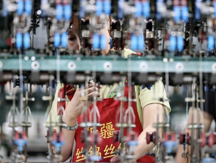 2025年7月29日,工人在新疆絲錦絲綢紡織有限公司生產(chǎn)車間內(nèi)的自動繅絲機上作業(yè)。近年來,新疆塔城地區(qū)烏蘇市引進(jìn)桑蠶繭絲綢智能化全產(chǎn)業(yè)鏈項目,鼓勵農(nóng)民種桑養(yǎng)蠶,拓寬興邊富民新“絲”路。