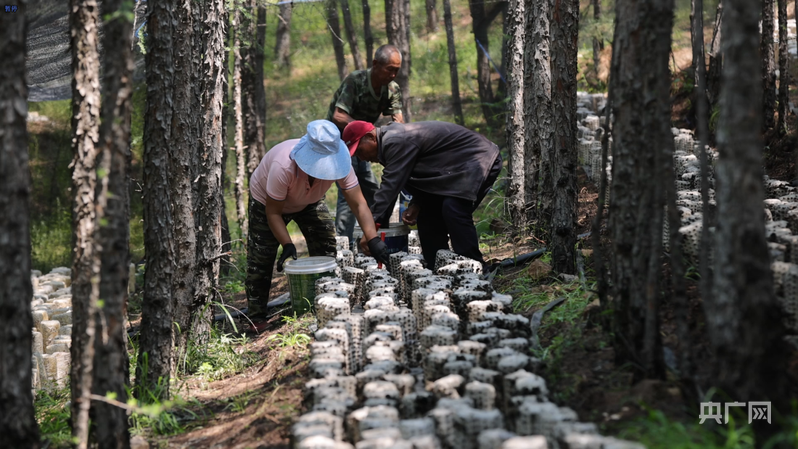 村民在馬鞍山林場林下經(jīng)濟(jì)試驗(yàn)示范基地采摘木耳(央廣網(wǎng)發(fā) 劉德胤 攝)
