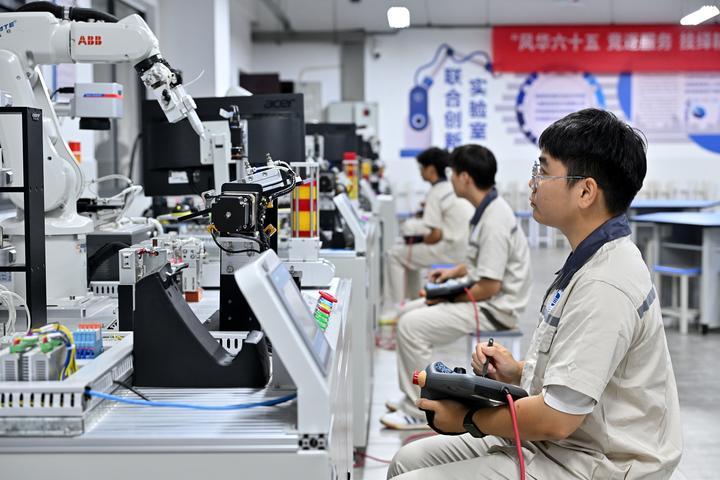 2024年7月26日,湖南鐵道職業(yè)技術(shù)學院的學生在工業(yè)機器人基礎(chǔ)應(yīng)用實訓室接受工業(yè)機器人操控技能訓練。教育部發(fā)布的數(shù)據(jù)顯示,近年來,現(xiàn)代制造業(yè)、戰(zhàn)略性新興產(chǎn)業(yè)和現(xiàn)代服務(wù)業(yè)70%以上的新增一線從業(yè)人員來自職業(yè)院校。職業(yè)院校已經(jīng)成為培養(yǎng)大國工匠、能工巧匠、高技能人才的主陣地。