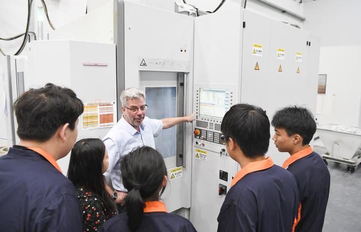 2024年4月16日,在位于重慶市永川區(qū)中德產(chǎn)業(yè)園的埃斯維(重慶)機床有限公司,公司技術(shù)總監(jiān)向重慶城市職業(yè)學院中德產(chǎn)業(yè)學院學生介紹設(shè)備操作規(guī)范。近年來,重慶城市職業(yè)學院聯(lián)合德國教育力量共建產(chǎn)業(yè)學院,引入職業(yè)教育先進經(jīng)驗,著力培養(yǎng)適合制造型企業(yè)需求的高素質(zhì)技能技術(shù)人才。