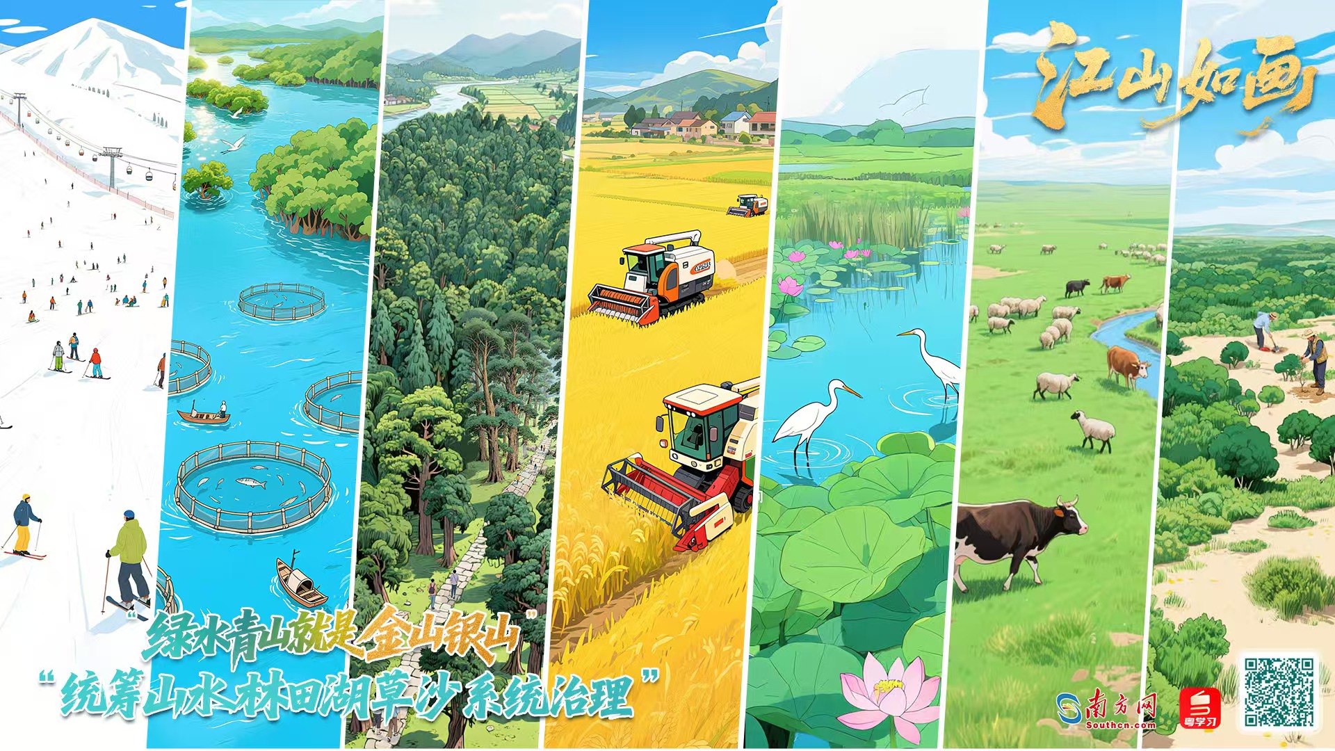 南方網、粵學習客戶端策劃制作“兩山”理念提出20周年紀念長卷——《江山如畫》,選取習近平總書記曾實地考察過的湛江紅樹林、白洋淀、青藏高原等80余個地點,沿海拔線一路攀升,描繪新時代“山水林田湖草沙一體化保護和系統(tǒng)治理”的生態(tài)文明建設新圖景。同步嵌入“習近平生態(tài)文明思想文庫”,立體呈現(xiàn)我國生態(tài)文明建設理論與實踐不斷深化、辯證統(tǒng)一的過程。