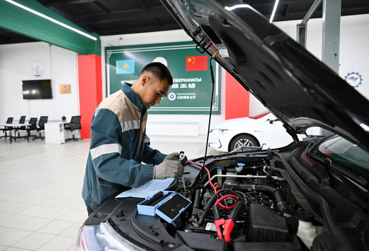 2025年5月9日,在哈薩克斯坦東哈薩克斯坦州首府厄斯克門的魯班工坊,學員練習汽車檢修技能。 新華社記者 李任滋 攝