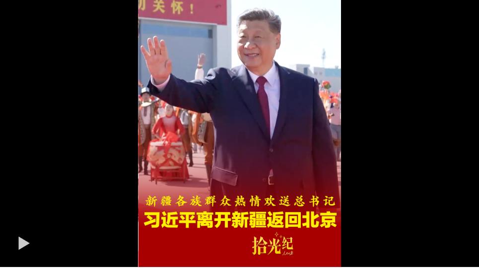 25日,習(xí)近平乘專機(jī)返回北京。烏魯木齊天山機(jī)場(chǎng)奏響別具特色的樂(lè)曲《我們?cè)谝黄稹罚髯迦罕娸d歌載舞熱情歡送總書記。