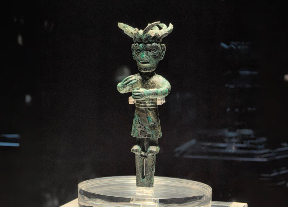 金沙遺址出土的銅立人,造型與三星堆青銅大立人相似(2025年4月9日攝)。三星堆遺址和金沙遺址都位于四川,距今約3600年至2800年,作為古蜀文明的兩個(gè)中心遺址,共同勾勒出古蜀文明前后相繼的輝煌圖景,其出土文物是中華文明多元一體的生動(dòng)例證。