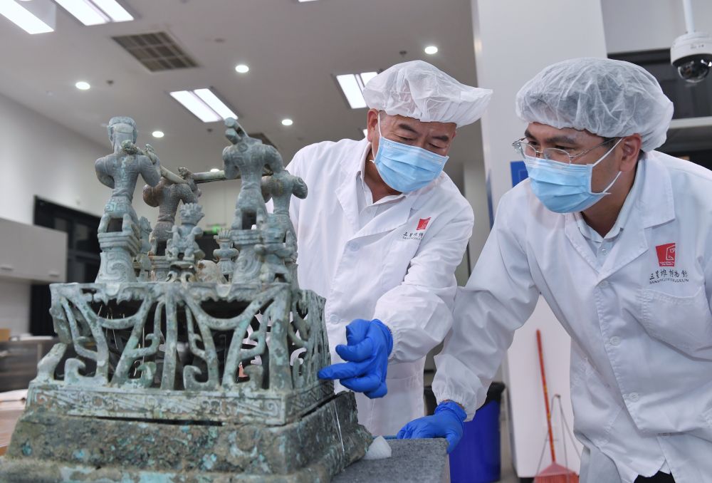 2023年5月30日,在四川三星堆博物館文物保護(hù)和修復(fù)中心,文物修復(fù)師郭漢中(左)與同事討論神壇底座修復(fù)方案。郭漢中從事文物修復(fù)工作已40余年,深度參與了三星堆祭祀坑的發(fā)掘工作,累計(jì)修復(fù)文物6000余件?!按蟾胚€有上萬(wàn)件文物等著修復(fù),需要一代接著一代往下干?!惫鶟h中說(shuō),他要把平生所學(xué)傳承下去,培養(yǎng)更多人才。