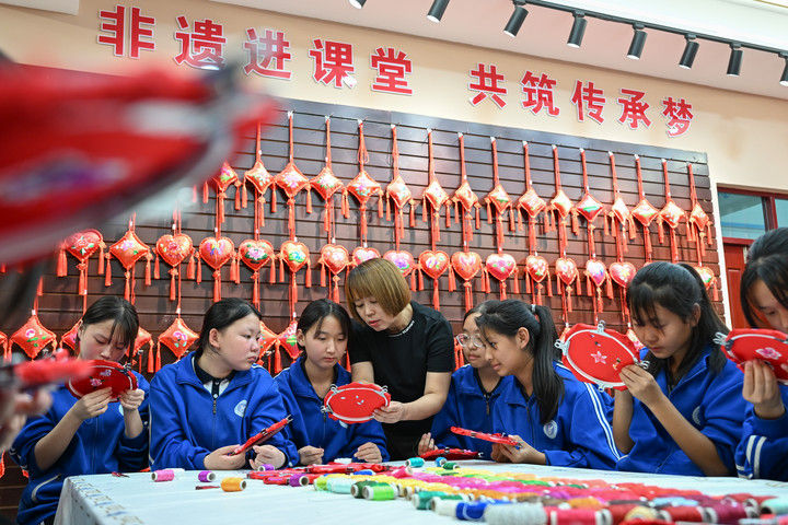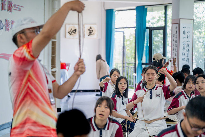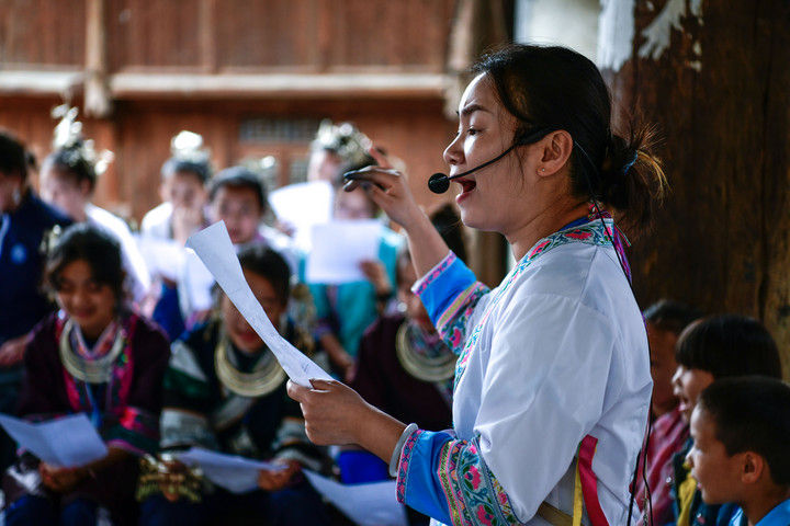 2025年9月26日,內蒙古興安盟科右中旗巴彥呼舒第六中學美術教師、非遺代表性傳承人吳斯琴(左四)指導學生刺繡。近年來,內蒙古興安盟科爾沁右翼中旗巴彥呼舒第六中學將當?shù)貒壹壏沁z圖什業(yè)圖刺繡引入校園,開設校本課程,并成立興趣社團,在豐富校園文化生活的同時,讓學生們近距離感受非遺的魅力,弘揚和傳承中華優(yōu)秀傳統(tǒng)文化。隨著國產動畫電影《哪吒之魔童鬧海》不斷刷新中國影史票房紀錄,參與電影配樂的貴州省榕江縣三寶侗寨的楊想妮和“舞樂蟬歌”團隊為更多人所熟知。樂團成員懷揣“用音樂傳遞侗族文化,讓世界聽見侗族大歌”的共同夢想,將侗族大歌推向更廣闊的舞臺。這是2025年4月22日,楊想妮在貴州省黎平縣肇興鎮(zhèn)廈格侗寨教前來研學的孩子們唱侗歌。