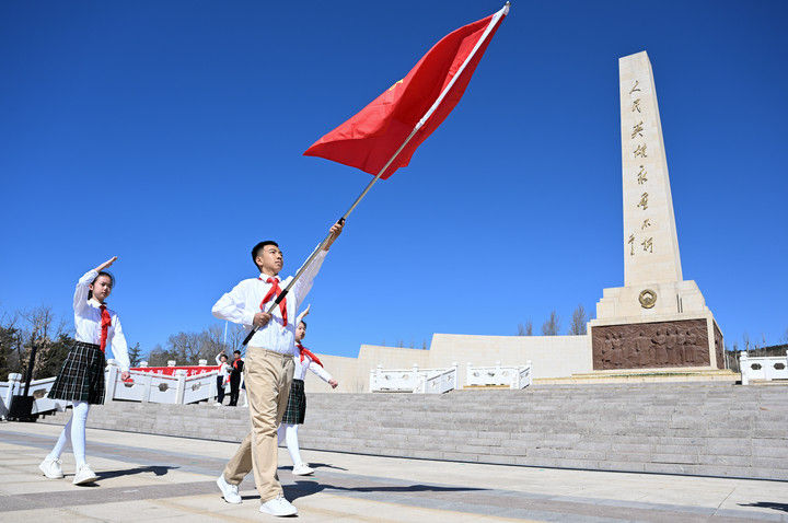 這是2025年4月2日在內蒙古呼和浩特市大青山紅色文化公園拍攝的中國少年先鋒隊出旗儀式。