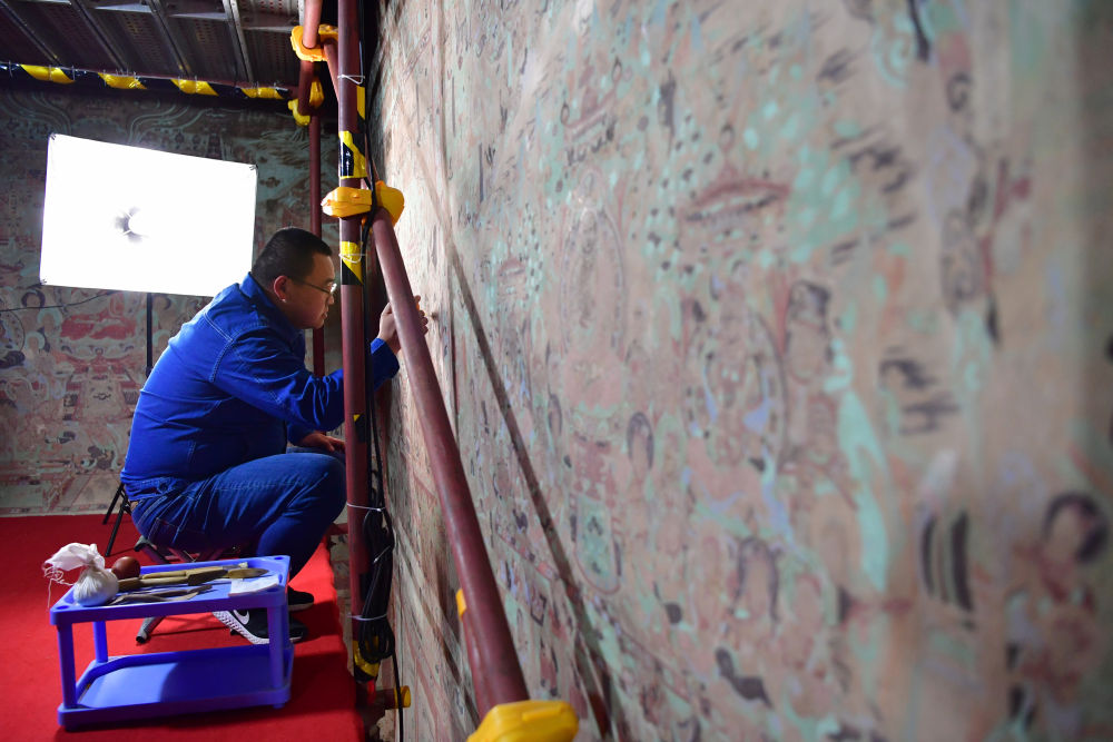 2022年4月19日,敦煌研究院文物保護(hù)技術(shù)服務(wù)中心的壁畫(huà)修復(fù)師楊金禮在莫高窟第231窟內(nèi)修復(fù)壁畫(huà)。