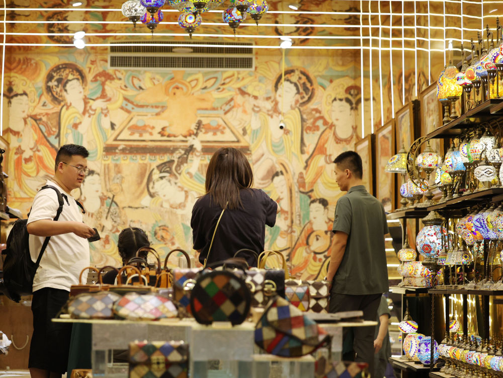 2025年6月26日,游客在敦煌夜市選購(gòu)文創(chuàng)產(chǎn)品。今年以來(lái),敦煌市全面改造敦煌夜市等特色街區(qū),圍繞敦煌深厚的歷史文化底蘊(yùn),融入壁畫(huà)、絲路文化等元素,通過(guò)布設(shè)文化景觀小品、打造沉浸式餐飲體驗(yàn)空間、上線特色文創(chuàng)產(chǎn)品等方式,給游客帶來(lái)多元體驗(yàn),“夜經(jīng)濟(jì)”持續(xù)升溫,不斷釋放文旅消費(fèi)潛力。