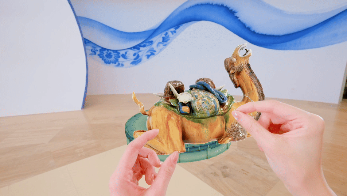 “這款MR眼鏡使用的就是3D技術,該技術能夠清晰地將文物的紋飾紋樣、顏色、形制等信息采集下來。戴上MR眼鏡后,觀眾能夠放大縮小、旋轉文物,增強了觀看體驗?!崩钤凑f。