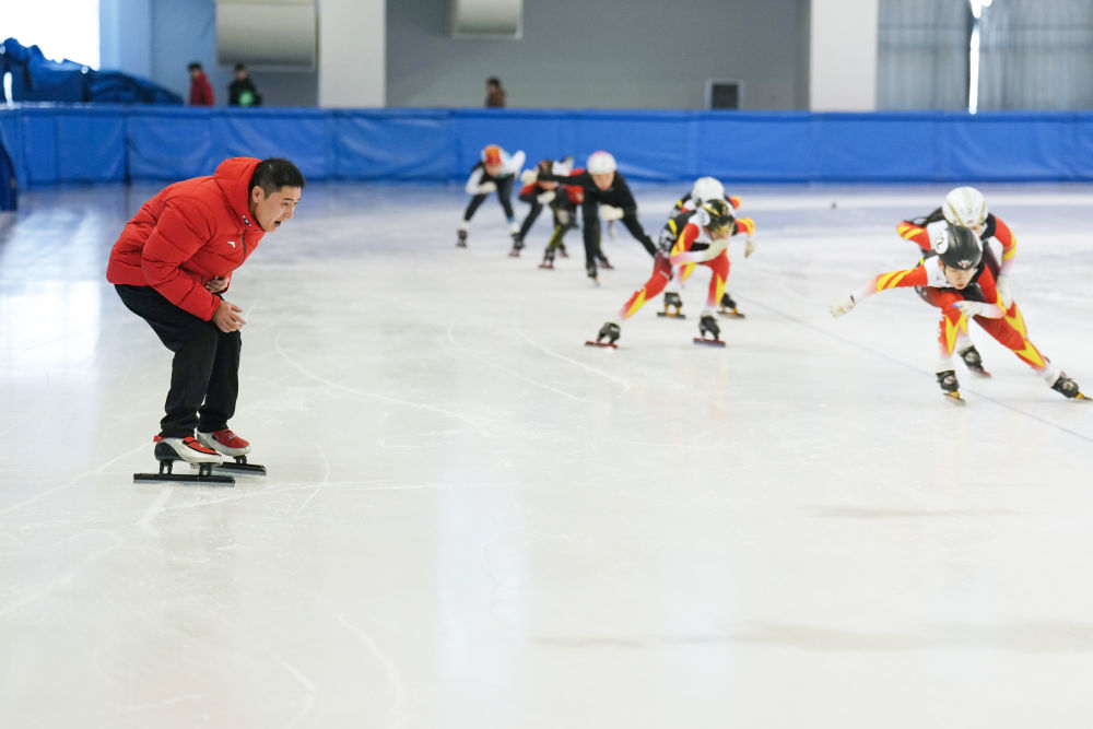 2025年1月24日,短道速滑教練姚忠華(左)在黑龍江省七臺河市短道速滑館指導(dǎo)運(yùn)動員進(jìn)行冰上訓(xùn)練。十余年來,姚忠華累計(jì)執(zhí)教培養(yǎng)過200余名運(yùn)動員。七臺河市擁有“奧運(yùn)冠軍之城”的城市名片,在這里,教練員們一起筑夢冰場,為我國冰雪人才的儲備奉獻(xiàn)自己的力量。