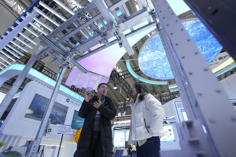 2026年1月6日,在2026哈爾濱國際冰雪經(jīng)濟(jì)博覽會展會現(xiàn)場,參會嘉賓(左)為參觀者介紹智能大型冰雕自動化搭建機(jī)器人。本屆博覽會旨在通過成果展示、產(chǎn)業(yè)交流與投資合作,展現(xiàn)“冰雪+經(jīng)濟(jì)”“冰雪+科技”等融合發(fā)展成果,為全球投資者提供市場機(jī)遇。