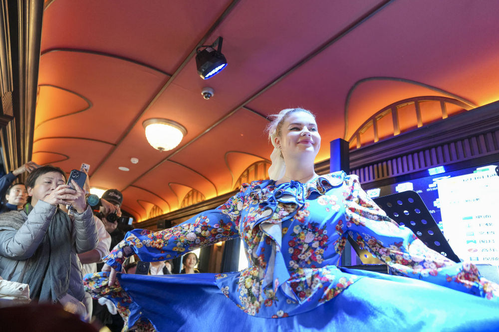 2025年12月6日,演員在黑龍江省“伊春號”旅游專列車廂中表演。當(dāng)日,“伊春號”旅游專列投入試運(yùn)行,40余名受邀體驗(yàn)的游客乘專列由哈爾濱站出發(fā),去往亞布力滑雪旅游度假區(qū)。2025年以來,中國鐵路哈爾濱局集團(tuán)有限公司陸續(xù)開行了多趟旅游列車,將特色體驗(yàn)、民俗展示、定制化服務(wù)等進(jìn)行融合,滿足游客需求,服務(wù)旅客出行。