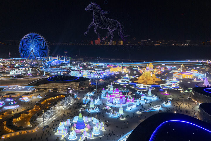 這是2026年1月5日拍攝的哈爾濱冰雪大世界園區(qū)的無人機(jī)表演(無人機(jī)照片)。