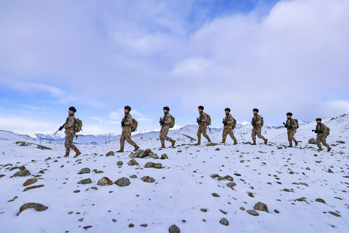2024年2月9日,駐守帕米爾高原的新疆軍區(qū)某邊防團紅其拉甫邊防連官兵踏雪巡邏。新華社發(fā)(姬文志 攝)