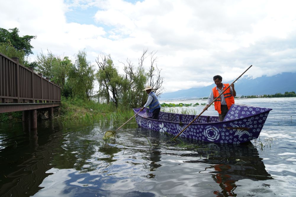 大理市灣橋鎮(zhèn)古生村位于洱海邊,是一個(gè)典型的白族傳統(tǒng)村落,已有1000多年歷史。近年來(lái),當(dāng)?shù)刈ゾo抓實(shí)洱海生態(tài)治理,古生村也因此受益,游客數(shù)量逐漸增加,當(dāng)?shù)卮迕癯掷m(xù)增收。這是2020年9月14日,村民在大理市灣橋鎮(zhèn)古生村水域清理水草。