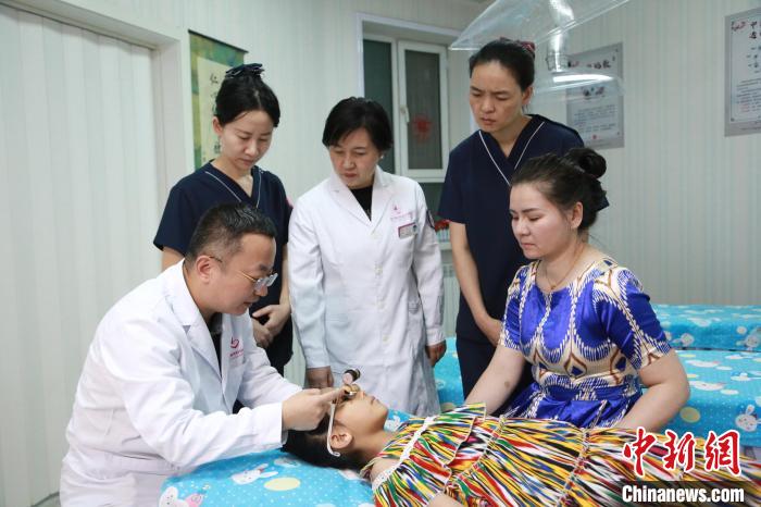 劉登教授在新疆庫爾勒市婦幼保健院現(xiàn)場帶教醫(yī)務(wù)人員應(yīng)用中醫(yī)“亢氏療法”技術(shù)為兒童治療近視。(上?!爸嗅t(yī)光明行”醫(yī)療隊供圖)