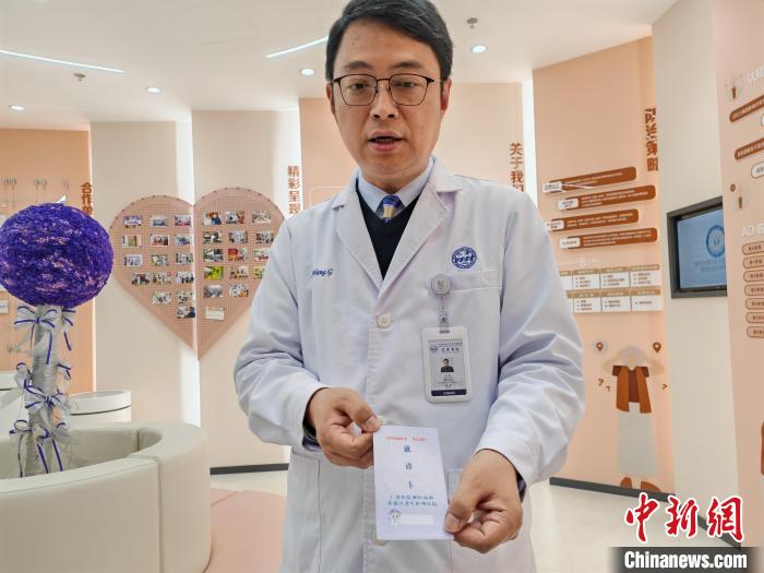 在黃浦區(qū)老年護(hù)理醫(yī)院,王剛教授團(tuán)隊(duì)與張揚(yáng)院長共同制作了就診卡和手環(huán)。就診卡上標(biāo)明患者在使用單抗,以提醒接診醫(yī)生。(中新網(wǎng)記者 陳靜攝)
