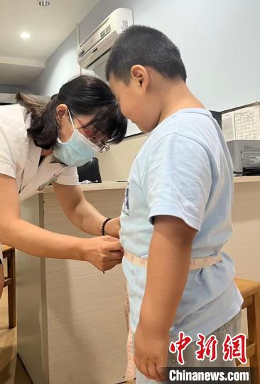 圖為西安市兒童醫(yī)院營(yíng)養(yǎng)科主任醫(yī)師劉瑞萍(左)測(cè)量?jī)和眢w數(shù)據(jù)。(受訪者供圖)