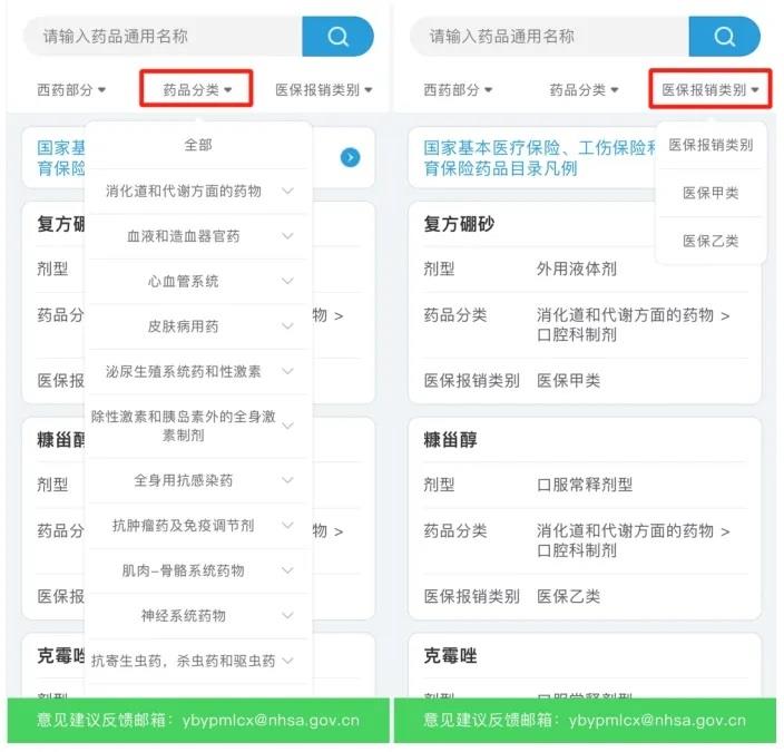 也可以根據(jù)自己的需求,選擇“藥品分類”或“醫(yī)保報(bào)銷(xiāo)類別”進(jìn)行篩選。