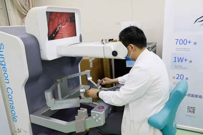 醫(yī)生正在進行手術(shù)機器人操作培訓(xùn) 北京大學(xué)首鋼醫(yī)院供圖