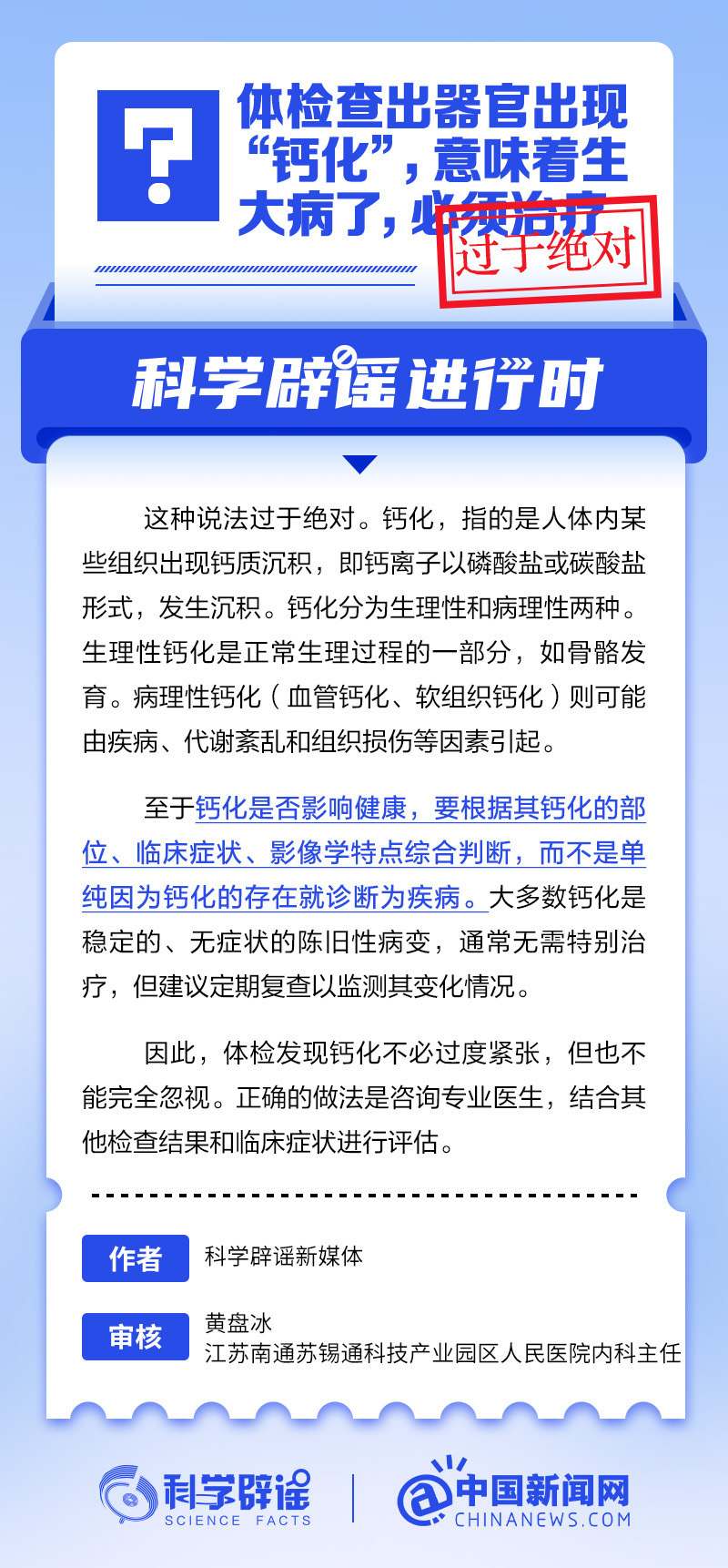 鈣化分為生理性和病理性兩種。生理性鈣化是正常生理過程的一部分,如骨骼發(fā)育。病理性鈣化(血管鈣化、軟組織鈣化)可能由疾病、代謝紊亂和組織損傷等因素引起。至于鈣化是否影響健康,要根據(jù)其鈣化的部位、臨床癥狀、影像學(xué)特點(diǎn)綜合判斷。大多數(shù)鈣化是穩(wěn)定的、無癥狀的陳舊性病變,通常無需特別治療,但建議定期復(fù)查以監(jiān)測(cè)其變化情況。(來源:@科學(xué)辟謠 中國新聞網(wǎng)微博 )