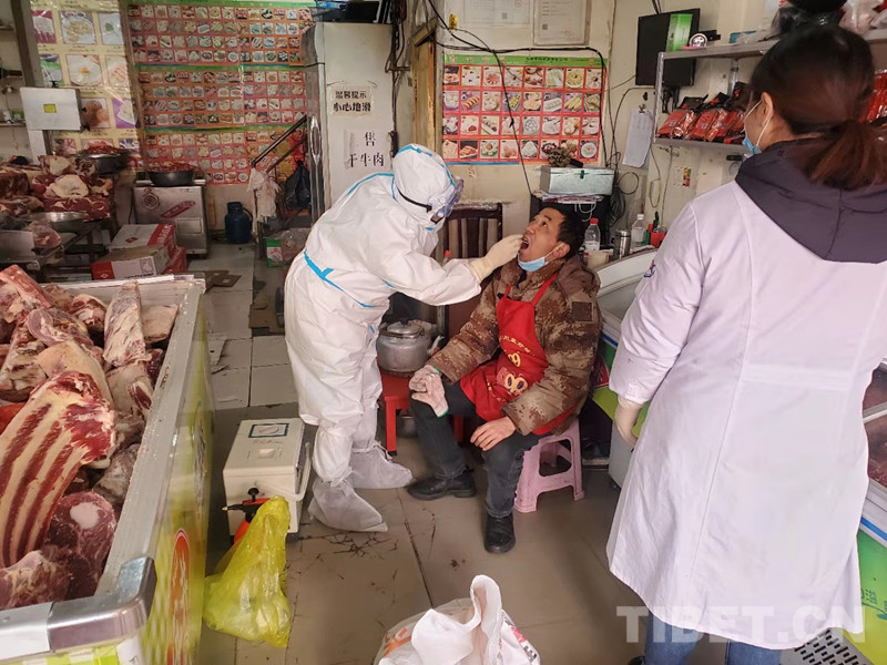 圖為醫(yī)務(wù)工作者對冷鏈?zhǔn)称废嚓P(guān)從業(yè)人員進(jìn)行核酸檢測