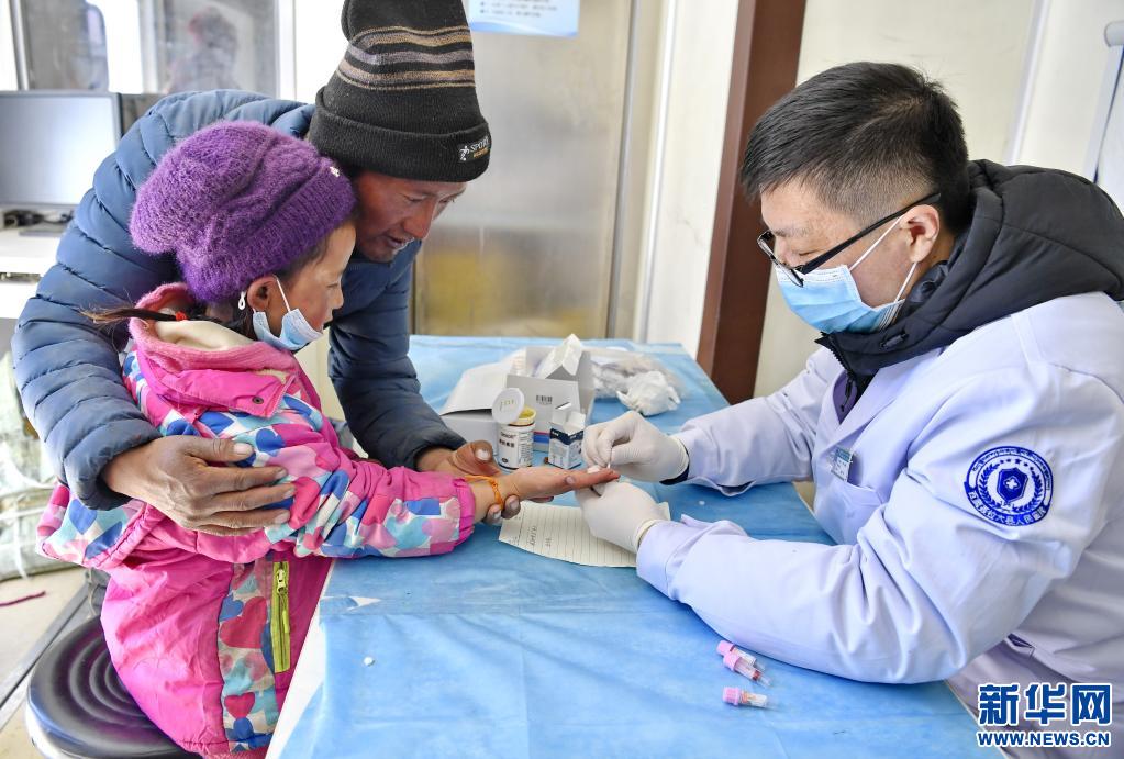 4月20日,在巡診車上,山東省煙臺(tái)市第五批援藏醫(yī)療隊(duì)醫(yī)生焦有誠(chéng)(右)為亞來(lái)鄉(xiāng)歐熱村村民采血檢驗(yàn)。新華社記者 張汝鋒 攝