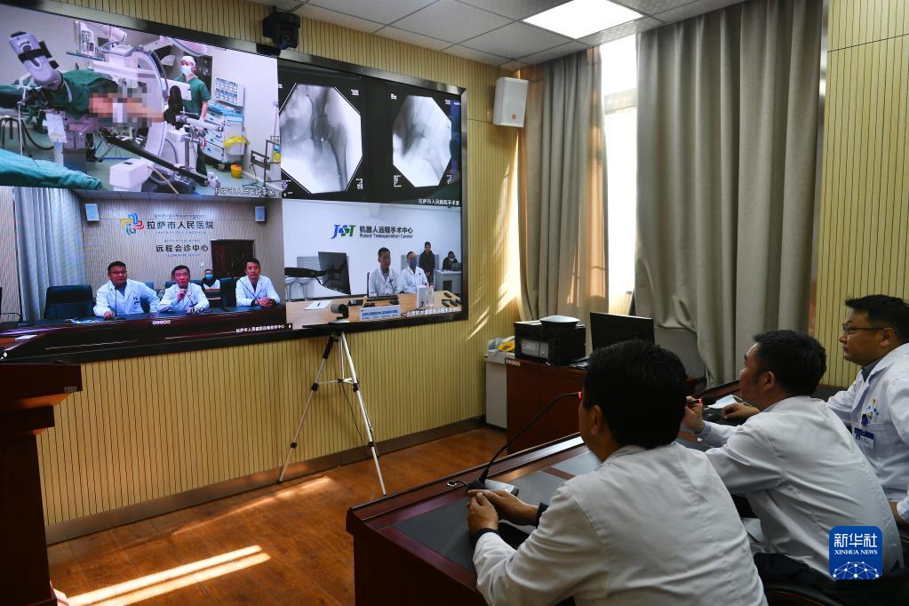 拉薩市人民醫(yī)院骨科醫(yī)生在北京積水潭醫(yī)院專家遠程指導(dǎo)下使用骨科機器人開展骨科手術(shù)(2021年4月19日攝)。新華社記者 孫瑞博 攝
