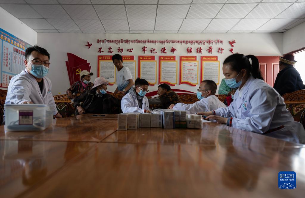 6月12日,王振疆(前右二)、王彤旭(前左一)、陳冰(前右一)和尼瑪益西(前左三)在村委會(huì)會(huì)議室為患者診治。新華社記者 費(fèi)茂華 攝