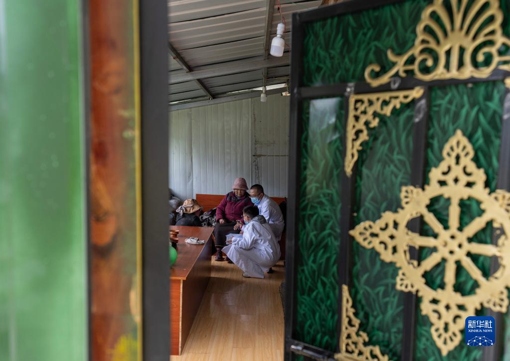 6月12日,王振疆(上左)、王彤旭(上中)和尼瑪益西(右一)協(xié)助陳冰(下右)為扎西央宗進(jìn)行產(chǎn)檢。新華社記者 費(fèi)茂華 攝