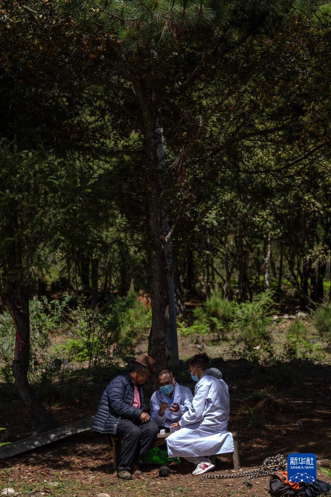 6月12日,在距離吞不絨村幾公里的路旁的樹(shù)下,王振疆醫(yī)生(右二)和尼瑪益西醫(yī)生(右一)在給普布多吉檢查身體。新華社記者 晉美多吉 攝